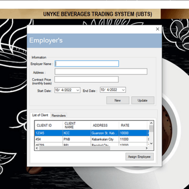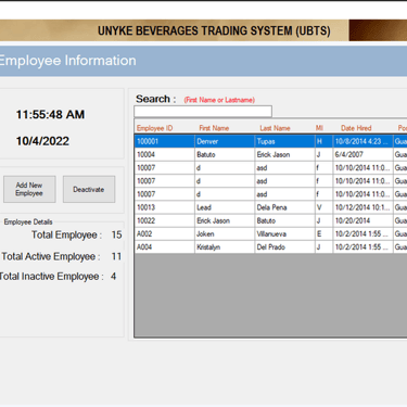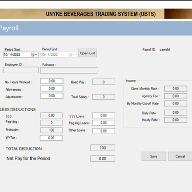 In 2022, I developed the HR and Payroll System for UNYKE Beverage Trading to support my client's new business venture. Using Visual Studio for coding and VB.NET as my programming language, I crafted a system tailored to their operational needs.